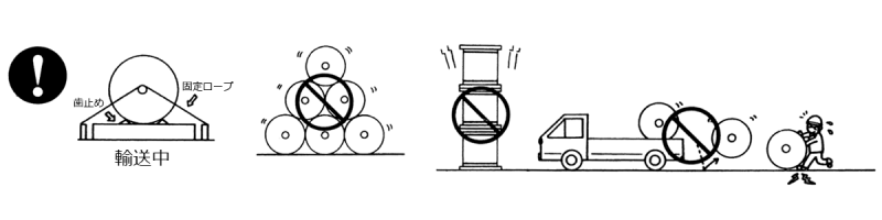 • 木枠(鉄枠)巻製品をてこで移動させる場合は、てこをロープに当てず、木枠(鉄枠)の縁に当てて下さい。